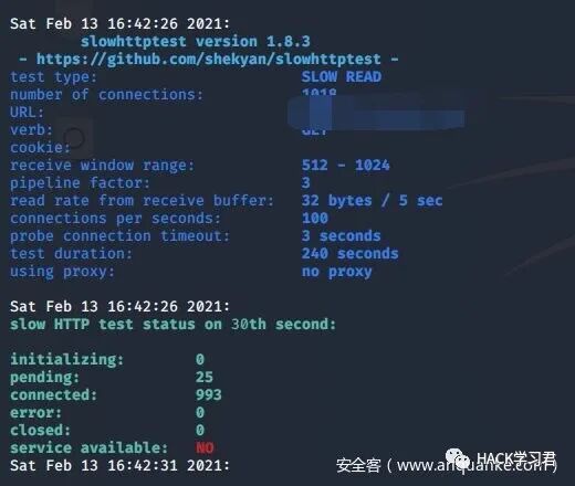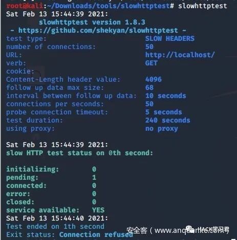 实际测试中我们使用 SlowHTTPTest,SlowHTTPTest 是一个可配置的应用层拒绝服务攻击测试工具,它可以工作在Linux,OSX和Cygwin环境以及Windows命令行接口,可以帮助安全测试人员检验服务器对慢速攻击的处理能力。