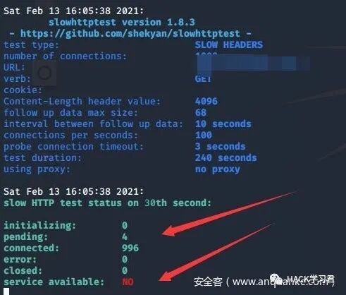 -o : 输出报告文件执行后可以看到,几秒钟后web服务器的连接池就被占满无法访问,当前连接数为996,目标服务器服务已不可用: