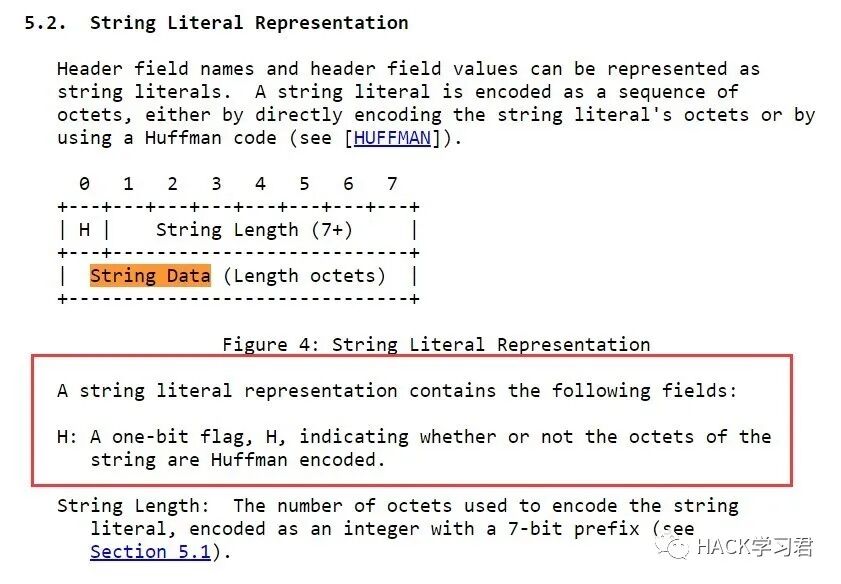 参照 RFC7541 ,如果H为0,则编码数据是字符串文字的原始八位字节。如果H是1,则编码数据是字符串文字的哈夫曼编码: