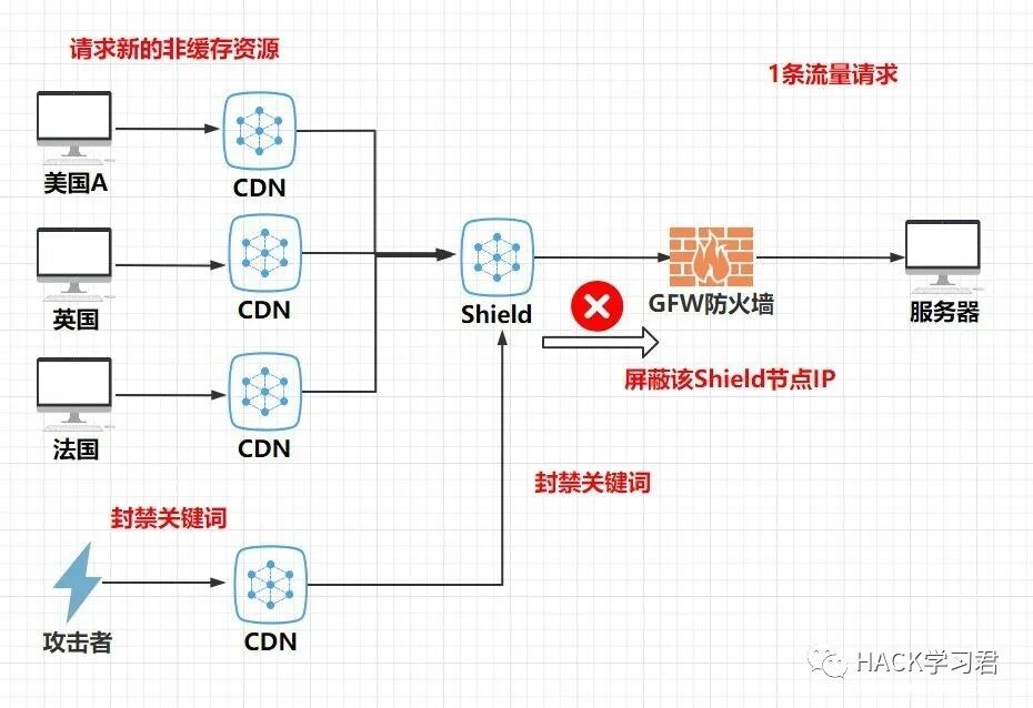 这种攻击源于CDN设计中的一种特性Shield,设想如下场景: