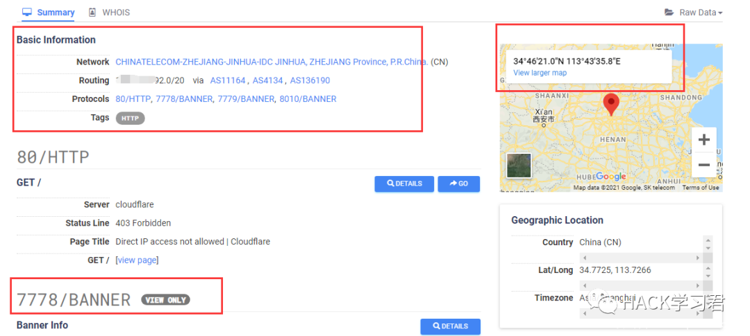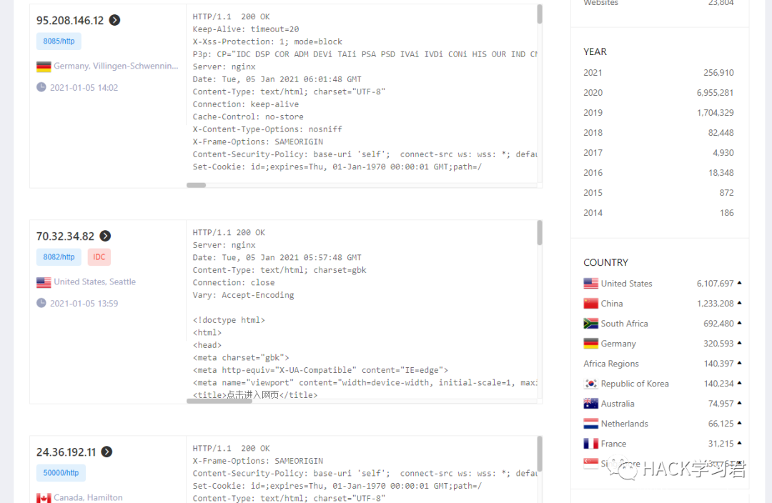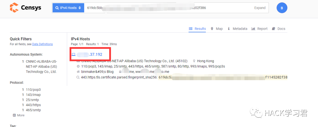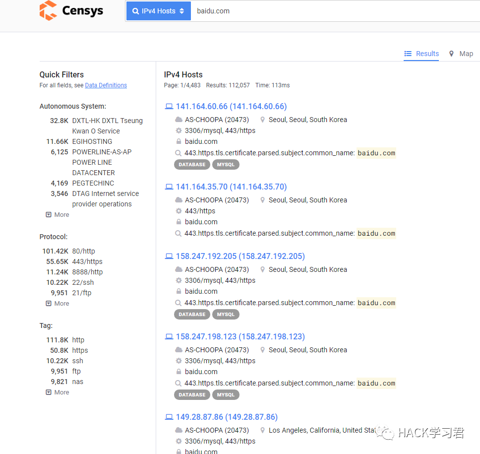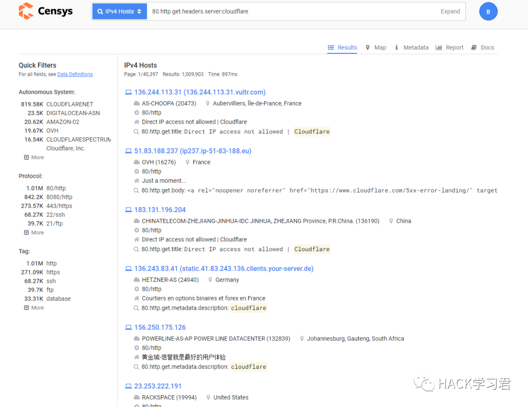 Censys 可帮助安全从业人员发现可从Internet访问的设备,包括 IP 地址、开放端口、物理定位、域名信息、托管服务商、SSL 证书 等等数据,从中发现需要的信息追踪到网站真实的 IP 地址。