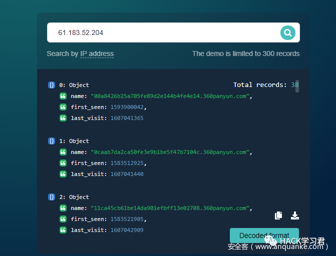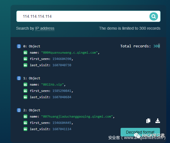 Whoisxmlapi 数据库包含了超过1.4亿多个域名生态数据,用来反查 IP 和 DNS 数据,在绕过 CDN 时候做反向对比非常有用。网站和 whoxy 一样,也是以 XML 和 JSON 格式返回数据,支持自定义。