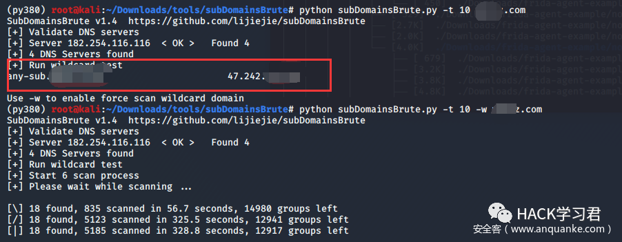 如图,我们针对一个泛解析的域名进行爆破,subDomainsBrute 会提示 any-sub 错误,之后使用 -w 参数开启泛解析强制爆破:
