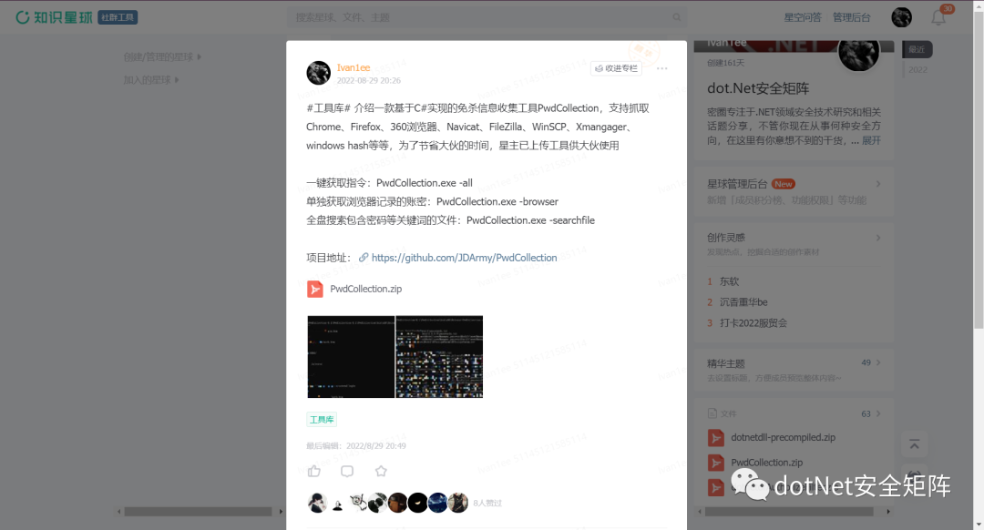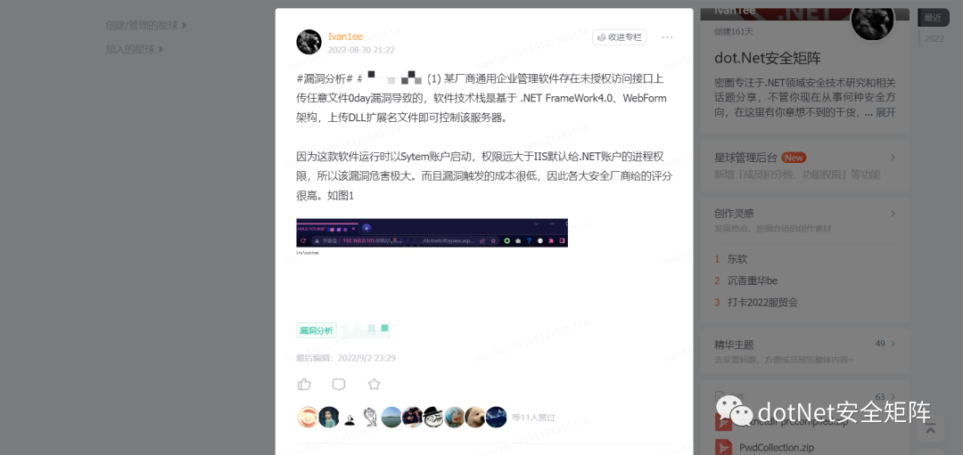 dotNet安全矩阵知识星球 — 聚焦于微软.NET安全技术,关注基于.NET衍生出的各种红蓝攻防对抗技术、分享内容不限于 .NET代码审计、 最新的.NET漏洞分析、反序列化漏洞研究、有趣的.NET安全Trick、.NET开源软件分享、. NET生态等热点话题、还可以获得阿里、蚂蚁、字节等大厂内推的机会。