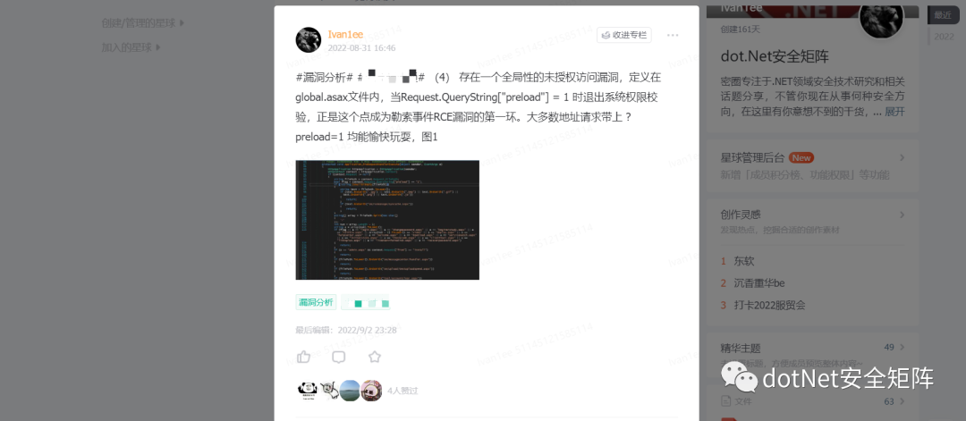 为了更好地应对基于.NET技术栈的风险识别和未知威胁,dotNet安全矩阵星球从创建以来一直聚焦于.NET领域的安全攻防技术,定位于高质量安全攻防星球社区,也得到了许多师傅们的支持和信任,通过星球深度连接入圈的师傅们,一起推动.NET安全高质量的向前发展。