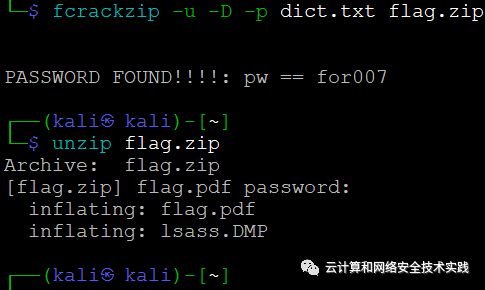 然后做密码爆破,fcrackzip -u -D -p dict.txt flag.zip,得到密码for007,