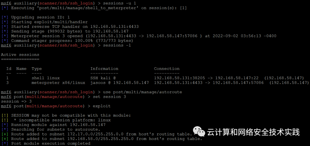 退出后再重新拉起个msf的shell,用msf使能自动路由,