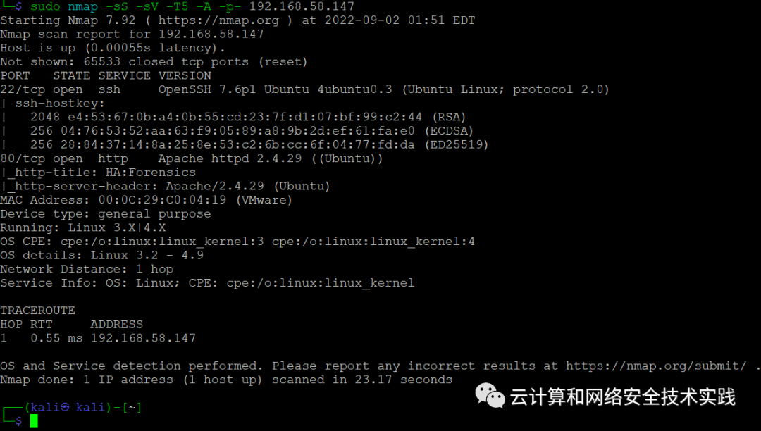 继续进行端口扫描,sudo nmap -sS -sV -T5 -A -p- 192.168.58.147,