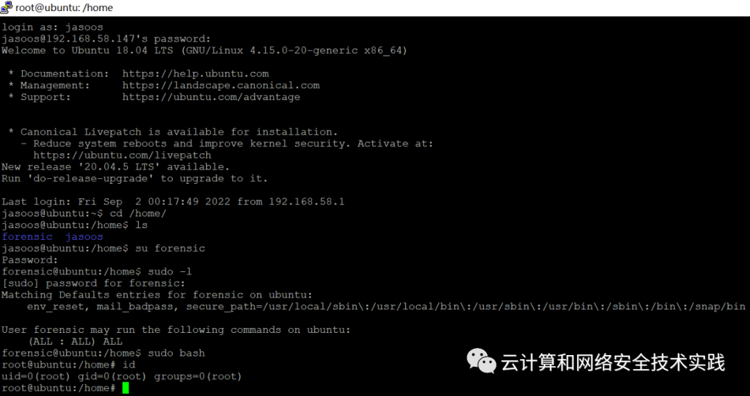再继续确认forensics用户有完全的sudo权限,直接切到root,