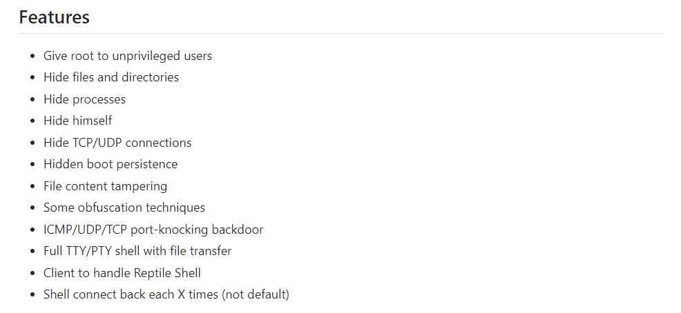 7.Reptile是一款开源的Linux RootKit木马程序,Linux RootKit木马功能非常强大,如下所示: