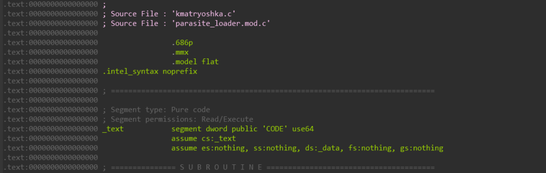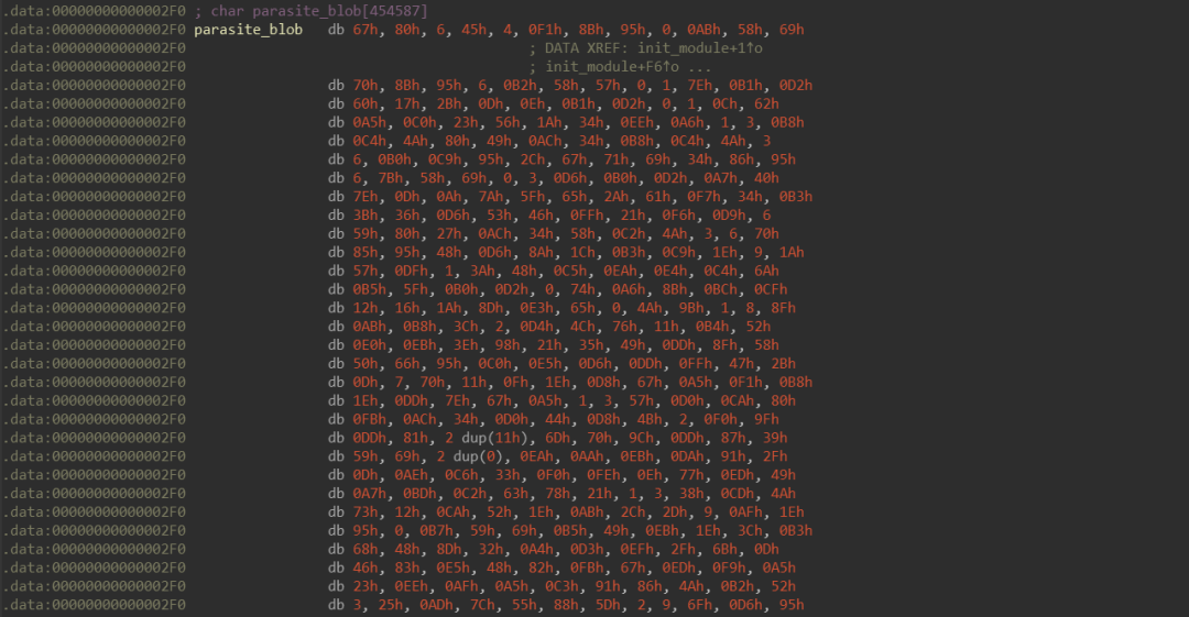 1.通过逆向分析,发现该恶意样本是一个Linux RootKit木马程序,样本参考了2018年H2HC(Hackers 2 Hackers Conference)会议上Matveychikov & f0rb1dd3分享的Linux RootKit高级技术,加载执行Linux Rootkit木马,如下所示: