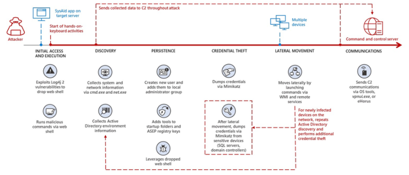 Mercury 又名 MuddyWater、Static Kitten、Seedworm、TEMP.Zagros, 是伊朗背景的威胁组织。近日,微软研究人员监测发现 Mercury 组织利用 Log4j 漏洞瞄准以色列组织展开攻击。该组织在过去的攻击中曾利用 Log4j2 漏洞瞄准易受攻击的 VMware 应用程序,此次该组织首次使用 SysAid 应用程序作为初始访问媒介利用漏洞展开攻击。威胁组织利用 SysAid Server 作为初始访问的载体,待获得访问权限后,MERCURY 使用自定义和开源工具以及内置操作系统工具在目标组织内提升权限、添加注册表项建立持久性、转储凭据并横向移动进行手动键盘攻击。邮箱网络钓鱼攻击:MERCURY 长期以来一直对目标进行鱼叉式网络钓鱼攻击,这些初始网络钓鱼邮件中包含指向或直接附加商业远程访问工具(例如 ScreenConnect)的链接。