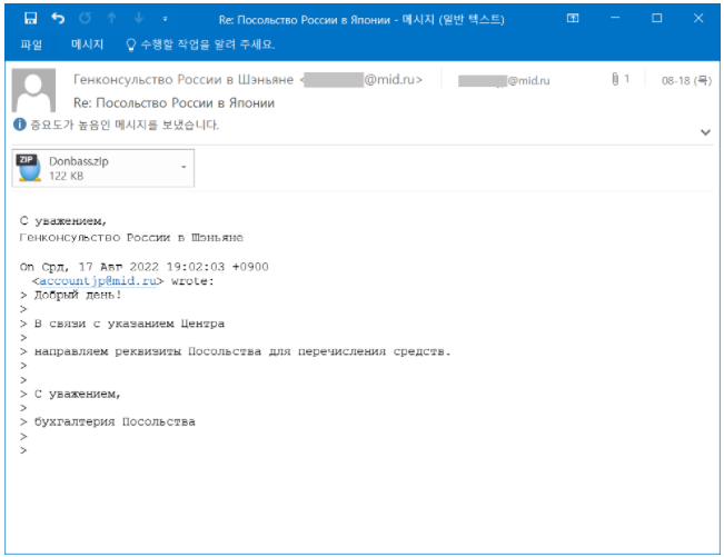 近期,研究人员捕获到 Kimsuky 组织针对俄罗斯外交部攻击活动的样本信息,经分析发现 Kimsuky 此次攻击是通过网络电子邮件进行的,并试图利用已失陷的俄罗斯驻沈阳总领事馆账户,对俄罗斯驻日本总领事馆展开进一步攻击。威胁组织通过伪装成大使馆会计部门向目标投递包含附件的钓鱼邮件,并以转移资金为诱饵诱使受害者点击嵌入恶意宏代码的文件,启动内嵌的 vbs 文件,通过设置任务计划与指定的 C&C 服务器通信,接收攻击者的命令,执行恶意操作。![]()