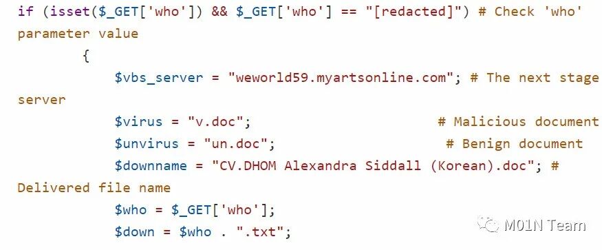 在新的攻击链中,攻击者发送包含嵌入式宏Word文档的鱼叉式网络钓鱼邮件。通过多阶段的受害者验证身份后,先是利用HTML感染受害者系统,之后投递一个VisualBasic脚本收集感染机器的信息。在此过程中攻击者滥用了大量合法的博客来托管恶意脚本,并最终部署Windows可执行文件类型的恶意软件。其多阶段的受害者验证C2服务器颇具新意,限制了安全研究人员对其的追踪、分析。