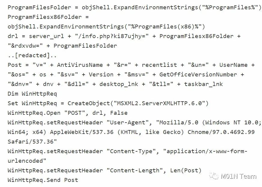 之后运行的恶意载荷将收集报告受害者的信息并创建用户获得持久化的计划任务。收集的受害者信息包含ProgramFiles 文件夹路径、防病毒名称、最近打开的文件列表、用户名、操作系统名称、操作系统版本、Microsoft Office 版本、.NET 框架版本、桌面文件夹中的文件列表以及用户固定的任务栏项目列表。这些信息将通过 /info.php?ki87ujhy=上传到C2服务器,在传递过程中攻击者又使用了一个小trick,在请求中将user-agent故意拼错为Chnome,其C2服务器验证后只会接受包含拼错的Chnome请求。