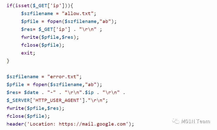 6. 二阶段C2服务器将接收到的IP地址存入allow.txt中,如果不包含ip参数会将此次访问写入error.txt中进行记录,将重定向到mail.google.com并响应一个良性文件