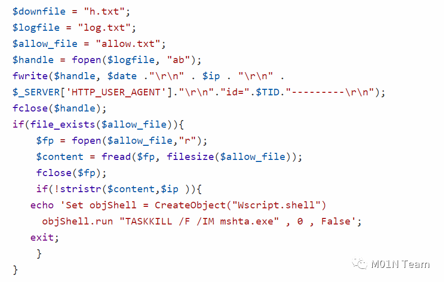 通过其后续服务器上的php脚本,攻击者在这一步又再次通过allow.txt来验证受害者的IP地址,如果通过,传递下一阶段的恶意载荷,否则将终止mshta.exe进程,结束响应。
