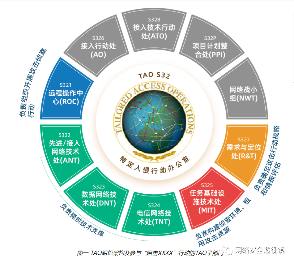 此次网络攻击行动是美国国家安全局(NSA)信息情报部(代号S)数据侦察局(代号S3)下属TAO(代号S32)部门。该部门成立于1998年,其力量部署主要依托美国国家安全局(NSA)在美国和欧洲的各密码中心。