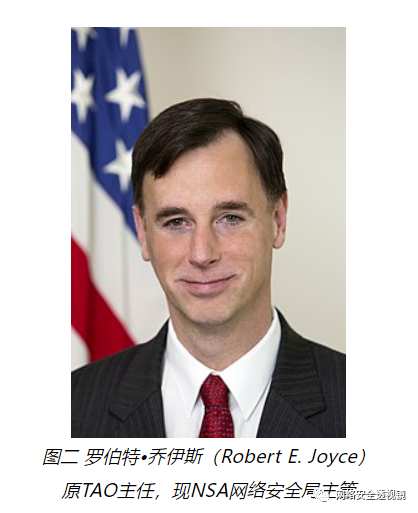 行动指挥人为:罗伯特·乔伊斯(Robert Edward Joyce)。此人1967年9月13日出生,曾就读于汉尼拔高中,1989年毕业于克拉克森大学,获学士学位,1993年毕业于约翰·霍普金斯大学,获硕士学位。1989年进入美国国家安全局工作。曾经担任过TAO副主任,2013年至2017年担任TAO主任。2017年10月开始担任代理美国国土安全顾问。2018年4月至5月,担任美国白宫国务安全顾问,后回到NSA担任美国国家安全局局长网络安全战略高级顾问,现担任NSA网络安全局主管。