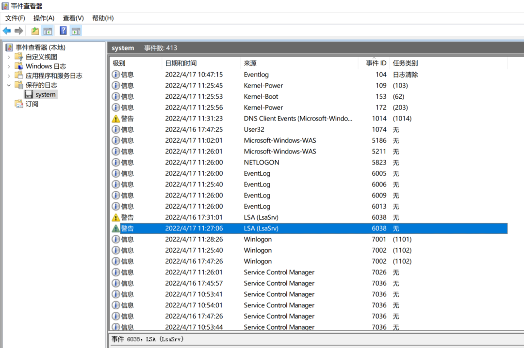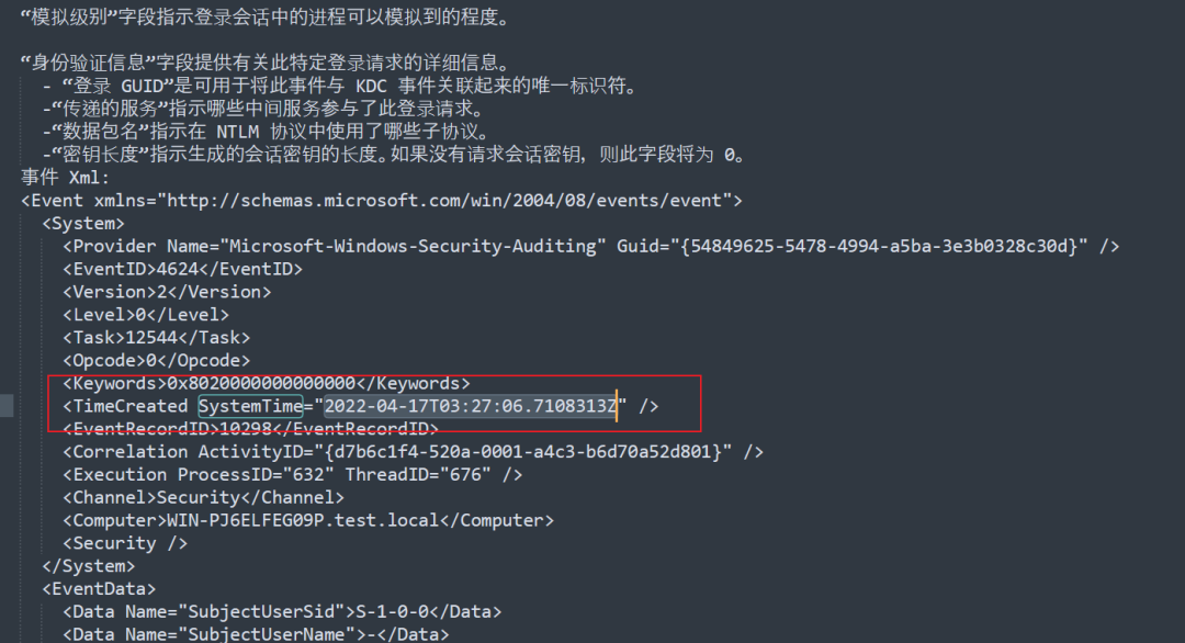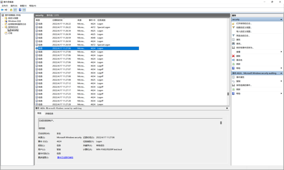 根据6038日志的时间(2022/4/17 11:27:06)在security日志中寻找该时间的logon日志,也就是4624,如下图所示,发现第一个就是: