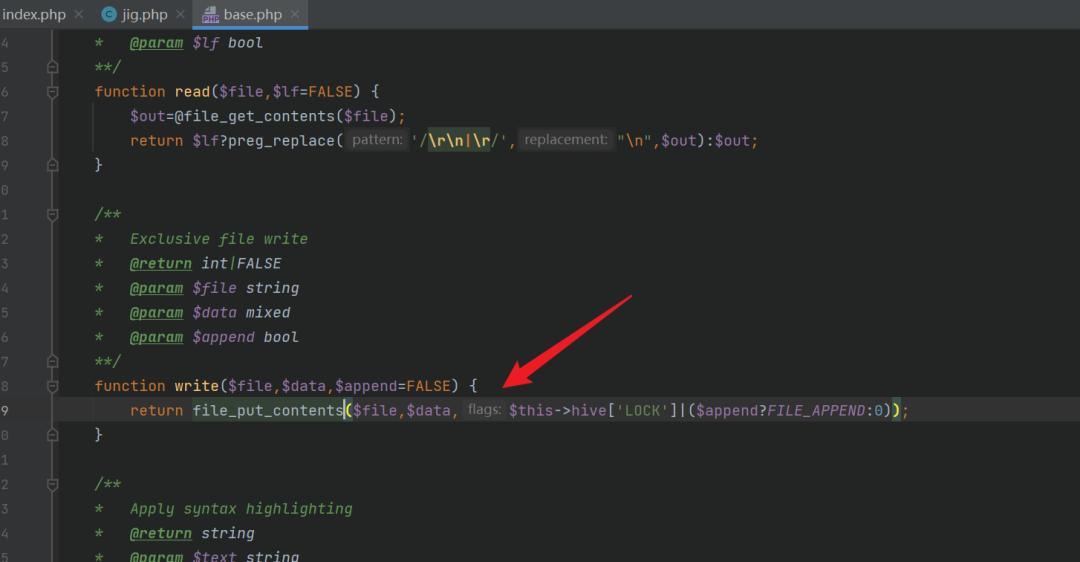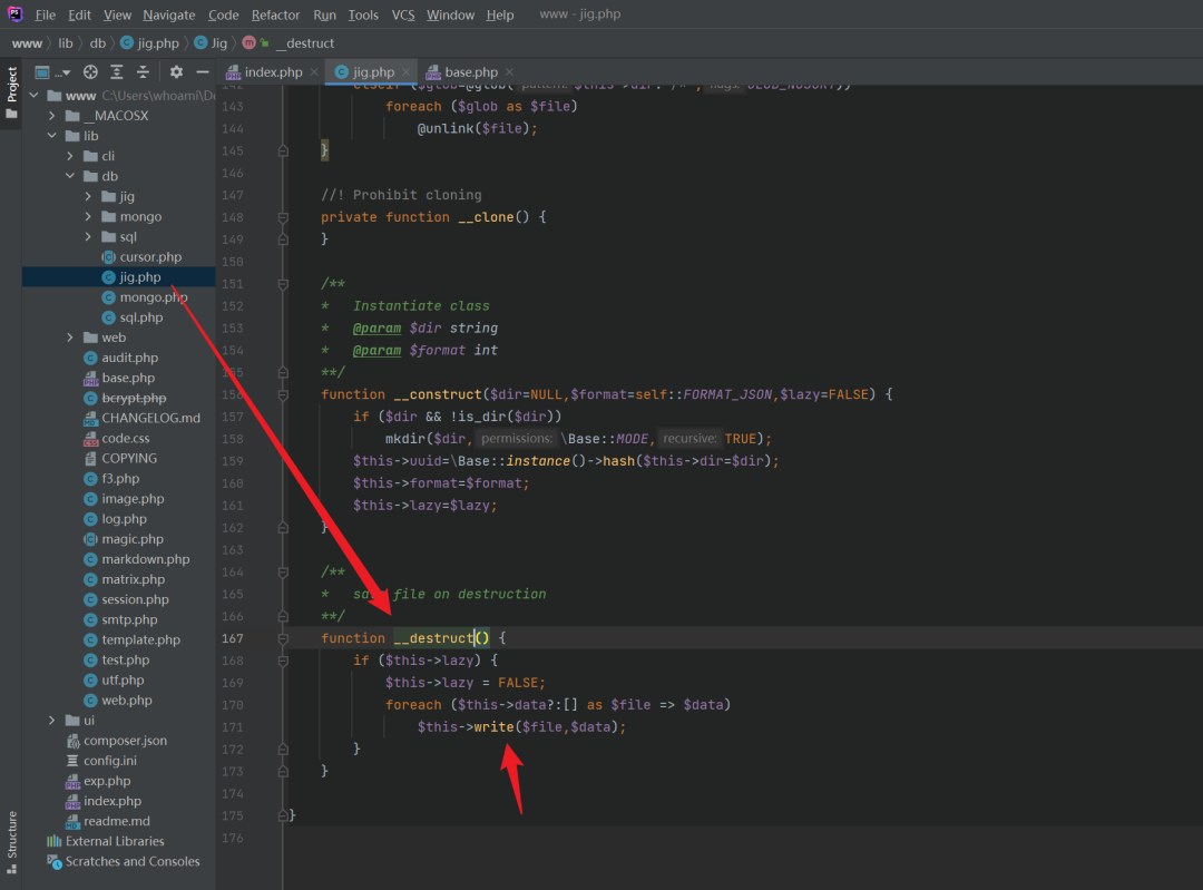 全局搜索 __destruct 方法,不多,在 jig.php 里可以看到一个 __destruct: