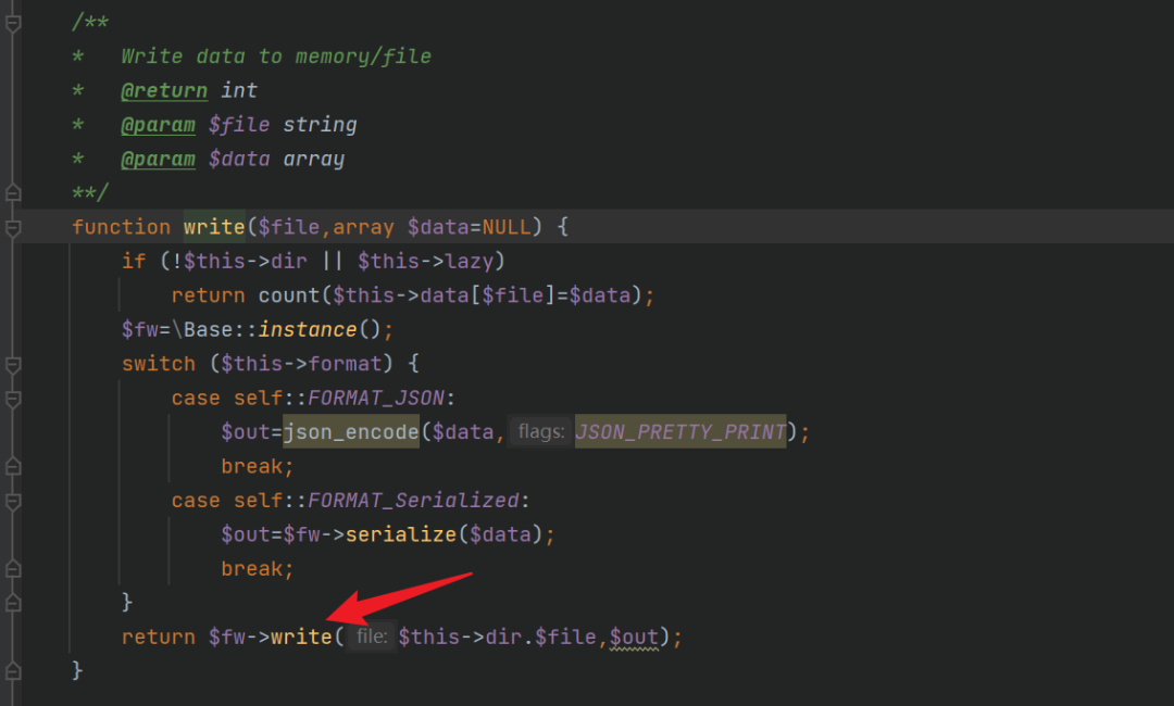 这里最后会进入到$fw->write(),我们跟进 $fw->write(),发现文件写入操作: