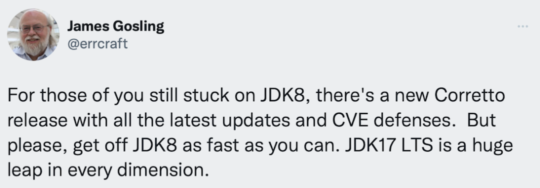 此前,Java 之父高斯林曾经发文表示可以尝试升级到 JDK17,因为JDK17是一个比 Java8 更好的版本,发文如下: