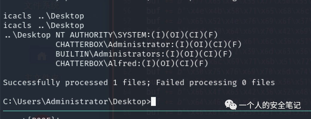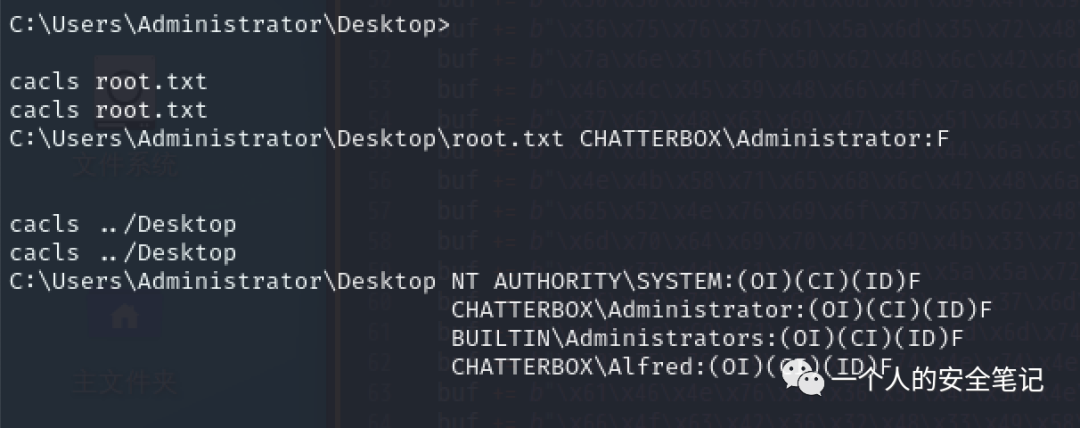 可以看到,对文件、文件夹的 ACL 控制策略 Alfred 用户具备完全访问(F),那么可以通过 /grant 参数授予指定的用户访问权限。通过 cacls 进行查看,当前仅有 Administrator 用户。