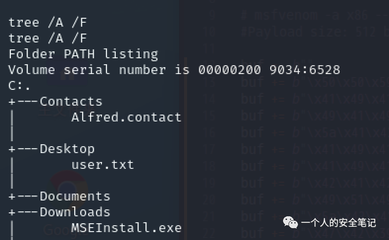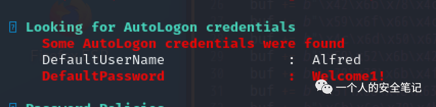 在 Kali 中启动 impacket-smbserver 文本共享服务,将 winPEAS 传递至服务器进行深度的信息收集。发现存在 Alfred 用户的登录凭证: