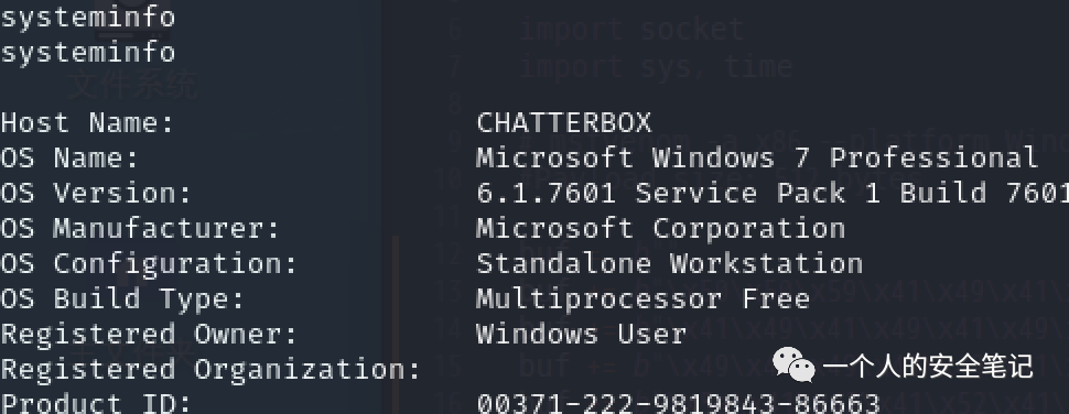 首先查看系统信息,当前的目标服务系统是 Windows 7 Pro,并且可以查看到已经安装过安全补丁,说明可以排除系统高危提取利用: