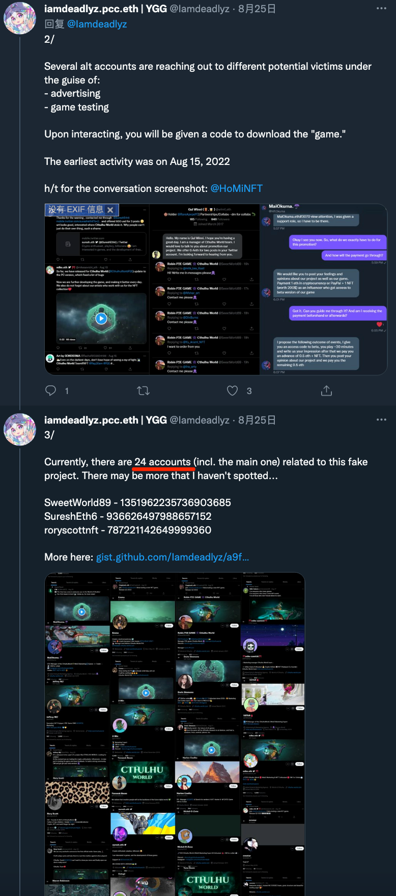 当时诈骗人员创建 24 个推特账户(包括主账户)进行诈骗推广。