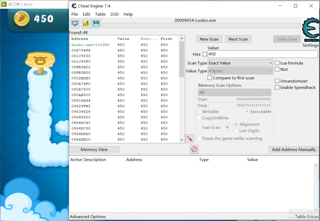 我们看到游戏中的金币数量是 450 。因此在右侧,填入当前金币数 450 ,并使用 First Scan 进行初次扫描。可以看到出现了一大堆地址。