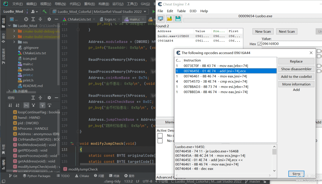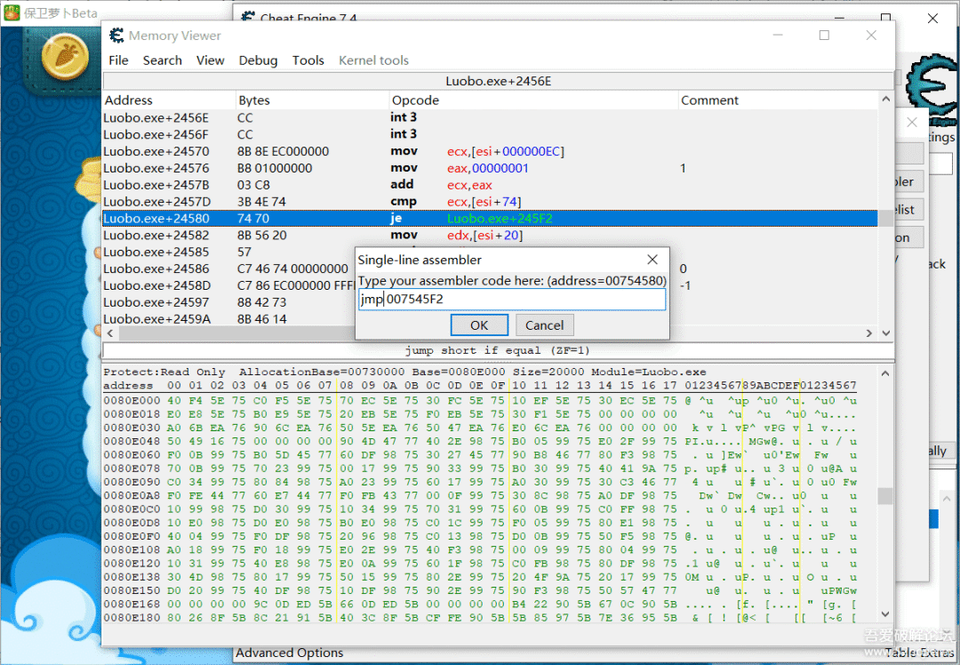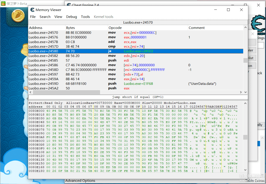 这里,我们留意记下这条 je 指令的静态地址为 Luobo.exe+24580 ,为后续编写内存修改器做准备。