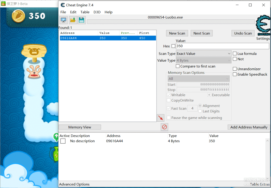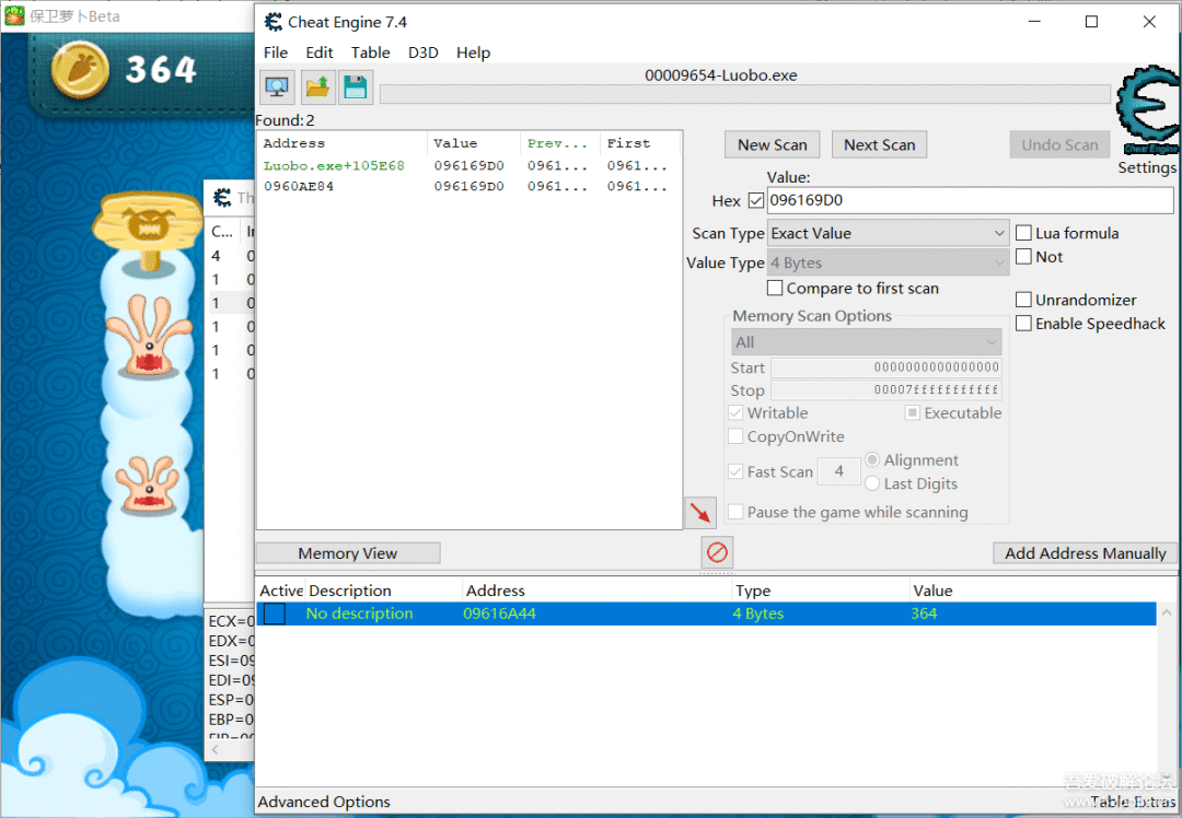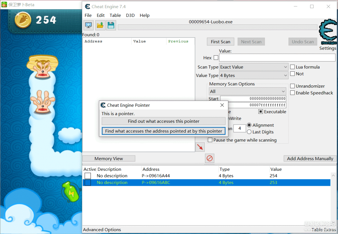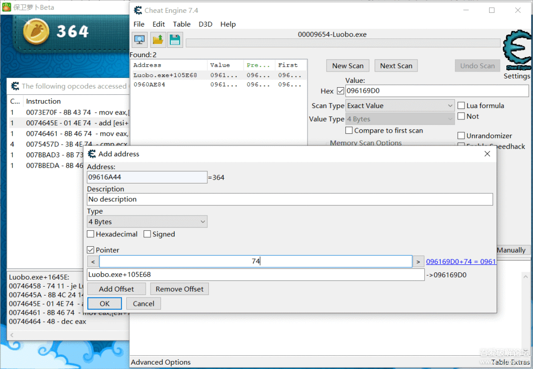 点击右下方 Add Address Manaually 按钮-勾选 Pointer ,在最下方填入 Luobo.exe+105E68 ,倒数第二个框填写偏移量 74,观察到最上方的内存地址中,运算出的值为 364,恰好为金币数,说明没有问题。(有兴趣可以退掉游戏重开下,发现该指针仍可以访问到金币,而之前的动态地址不行)
