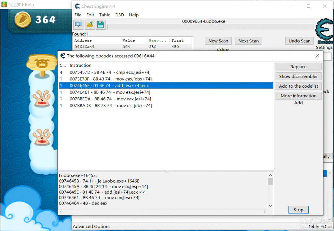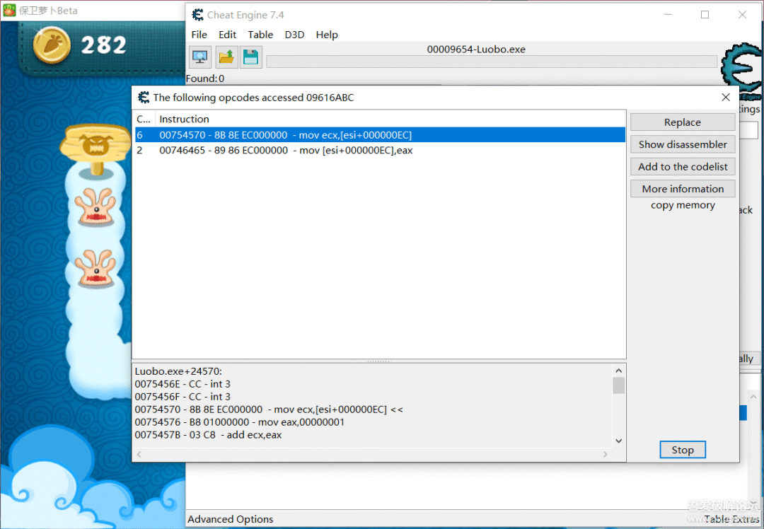 在主窗口下方,将金币的指针复制一份,把偏移量改成 EC,右键查访问,选择 Find what accesss the address pointed at by this pointer ,接着再随意打怪或者升级下炮塔,然后暂停游戏。