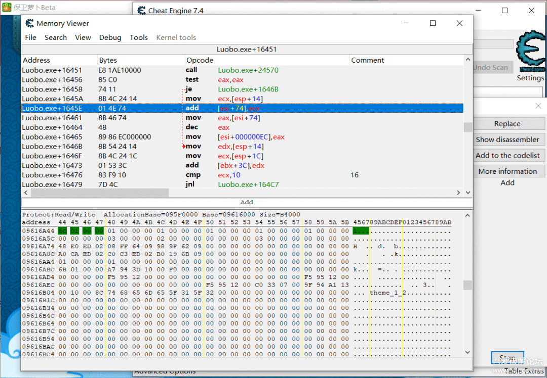 这些代码实现的是“将校验值加一之后与金币值比较,如果相等则跳转到 Luobo.exe+245F2”。(对应操作码:0x74 0x70)