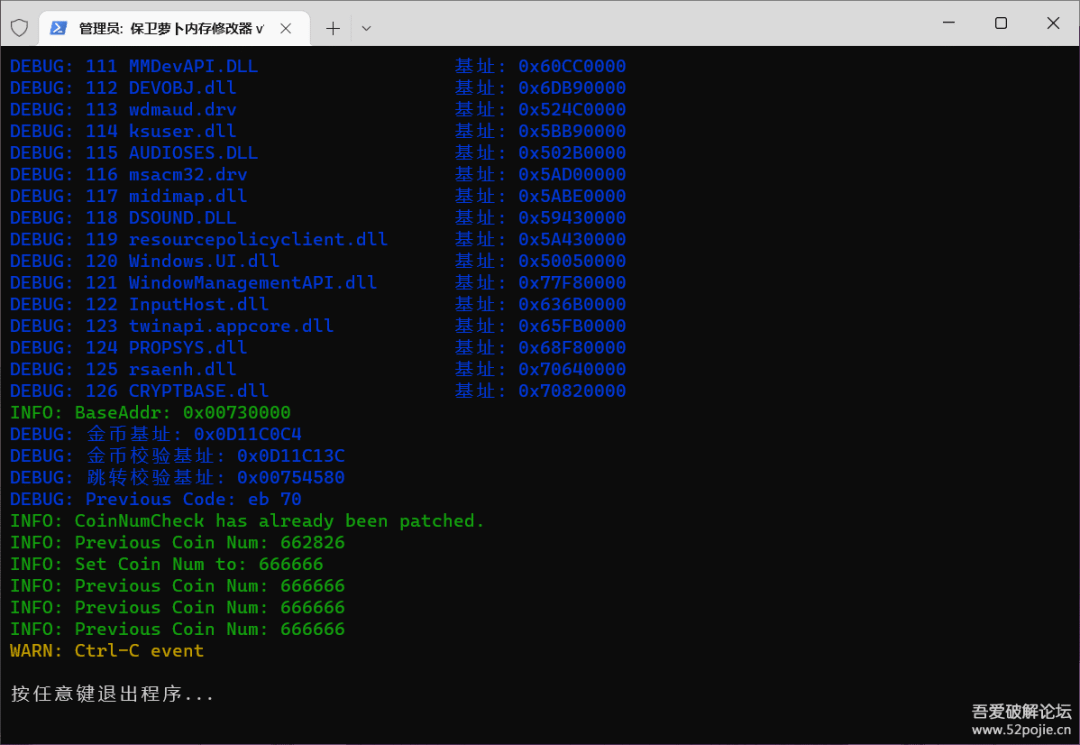 按照前文提到的大佬的分析,金币是有校验的。我们需要破坏这个校验,防止程序闪退。第一步还是需要找到校验指令所在内存区域的基址。
