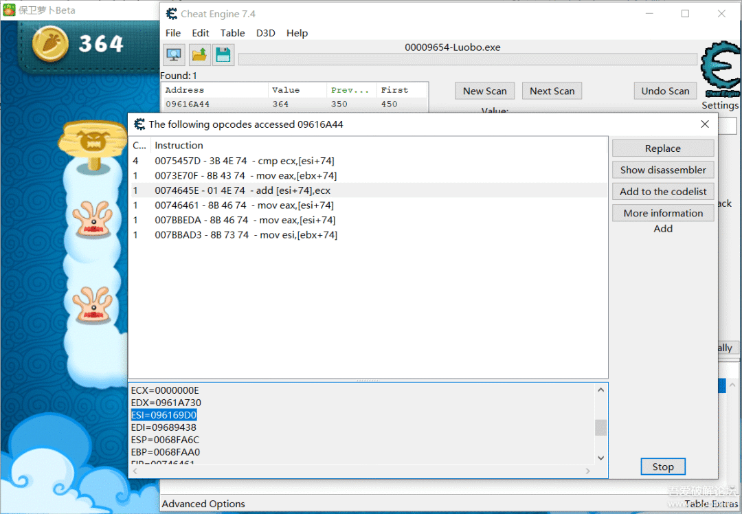 很明显,这个 add 指令就是用于增加金币的,而且金币的地址是 esi+0x74 。我们往下拉一下,可以看到 esi 的地址。我们把它选中复制下来。