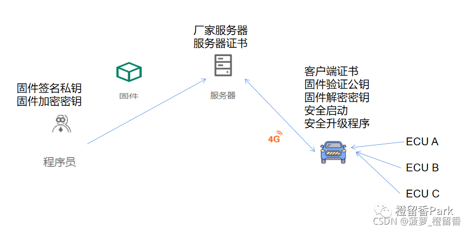 首先,汽车厂家发布新版本固件到升级服务器,新版本固件包含了对漏洞的修复或者对性能的改进。