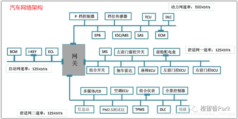 低速CAN总线(Low Speed CAN,CAN-B):CAN-B的标准是ISO11898-3,速率是 5~125kbit/s,对汽车舒适系统和车身控制系统(如天窗、车门等)的一些应用来说这个速率是足够的,CAN-B应用的例子如下: