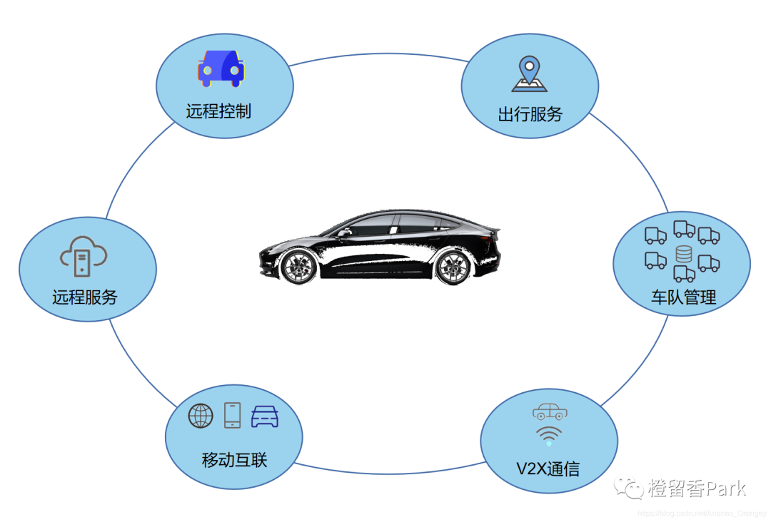 联网的车(Connected Car):又称网联汽车,即这些车具有网络连接功能,通常还具有Wi-Fi热点功能用于和其他设备分享车载网络连接。具有网络连接功能的汽车通常还会扩展出其他功能来充分利用网络连接带来的优势,例如车祸自动报警求救、远程控制、远程升级[Over the Air(OTA)Update]、安全预警等。