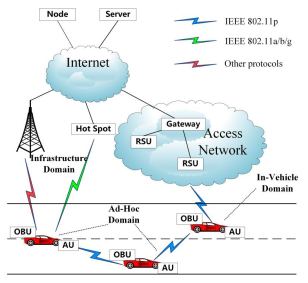 VANET的概念起源于移动自组织网络(Mobile Ad-hoc Network,MANET) , 继承了其动态拓扑、自动组网和位置分散的特点。VANET的基本架构中主要包含两种类型的车辆通信:车辆到车辆(Vehicle-to-Vehicle,V2V)通信,车辆到基础设施(Vehicle to Infrastructure,V2I)通信。通过V2V通信,车辆可以实时监控附近道路上其他车辆的信息,为驾驶提供高科技解决方案,实现车辆安全和智能驾驶。通过V2T通信,车辆可以获知有关周围各种设施的信息,实现数据网络访问和服务信息获取。VANET的通信系统通常由路边单元(Road Side Unit,RSU),车载单元(On-board Unit,OBU)和专用的短距离无线通信协议组成,确保了车辆能够在移动环境下能够获得网络接入。