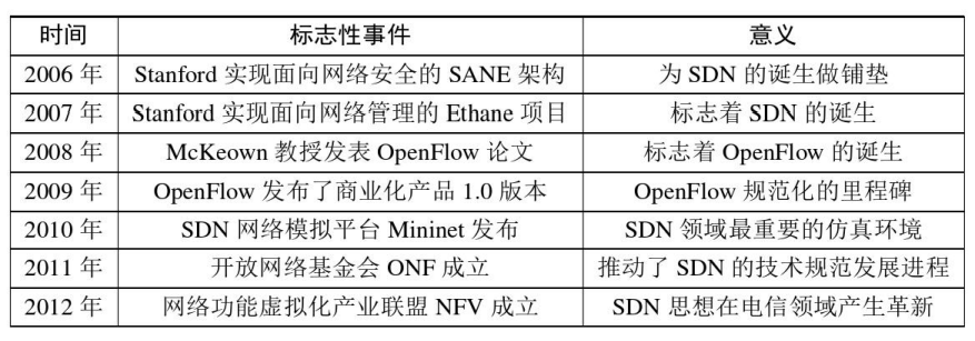 SDN的概念最早由美国斯坦福大学的McKeown教授及其团队提出,主要目的是用于解决传统因特网封闭式网络架构设计带来的难以进化发展的问题。从网络发展历史来看,SDN的诞生具有其客观必然性。传统网络经历了几十多年的发展早已变得臃肿不堪,期间产生了为数众多的的通信协议和网络设备,每一次新型协议部署和设备升级都耗时耗力,越发困难重重。SDN凭借其数据转发和控制分离的新颖思想快速获得了来自学术界和工业界一致的青睐。时至今日,全世界已经有诸如谷歌、Facebook等大厂将SDN技术应用于其商业化的数据中心。SDN的早期发展历史如表1所示。