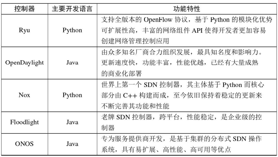 目前世界上主流的SDN控制器均支持OpenFlow协议,部分还支持其他类型 的南向接口协议,因此一般对OpenFlow控制器和SDN控制器两个概念不加以明确区分。目前已经出现了许多种类的开源SDN控制器,每种各有其优势和特点。基于Python模块化开发的Ryu以及软件商与设备商主导的OpenDaylight是最著名的两大SDN控制器。主流的SDN控制器对比如表2所示。