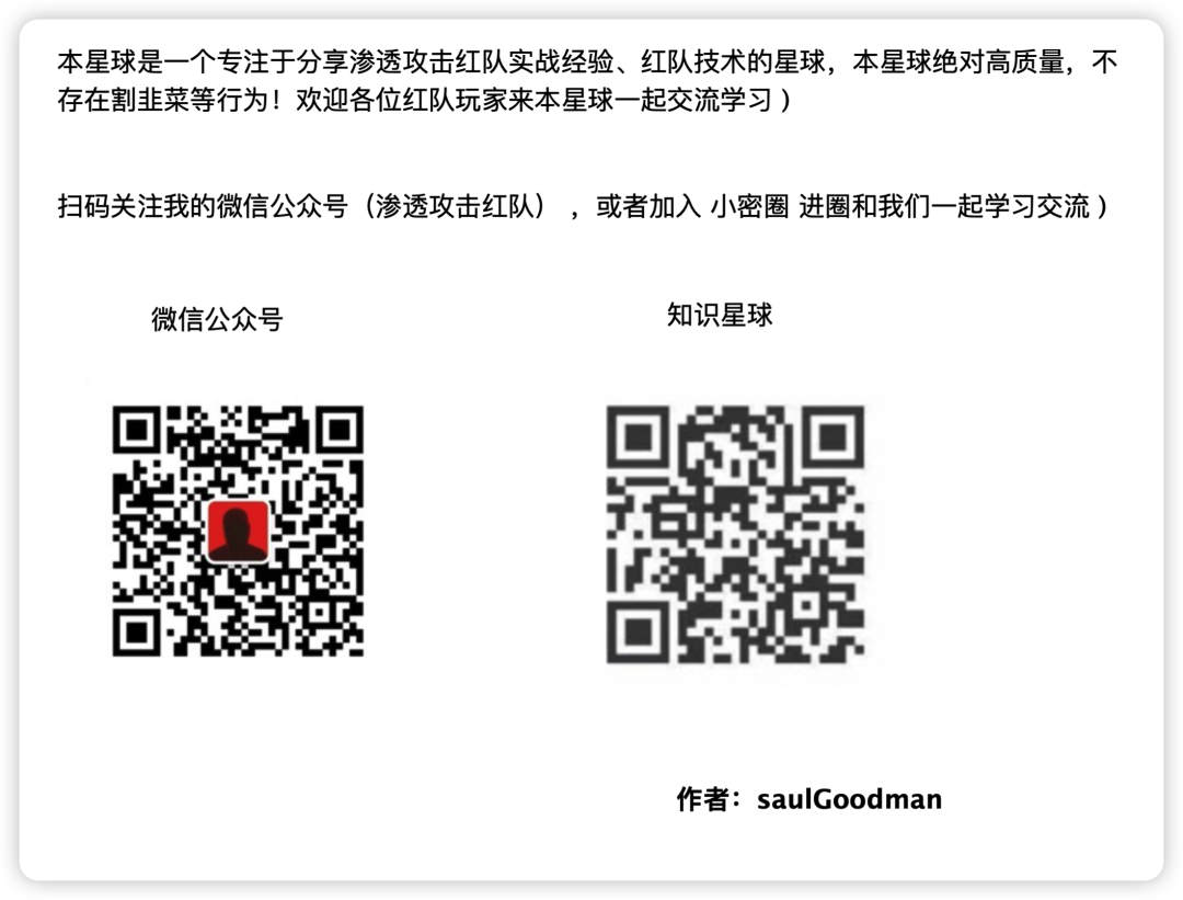 大家好,这里是 渗透攻击红队 的 RedTeam 系列文章,我是 saulGoodman ,对于本文的这些技术分享来自于我的知识星球:渗透攻击红队,公众号以后花费的精力会比较少,目前注重于知识星球的维护和更新 RedTeam 文章,欢迎各位来我星球学习交流!