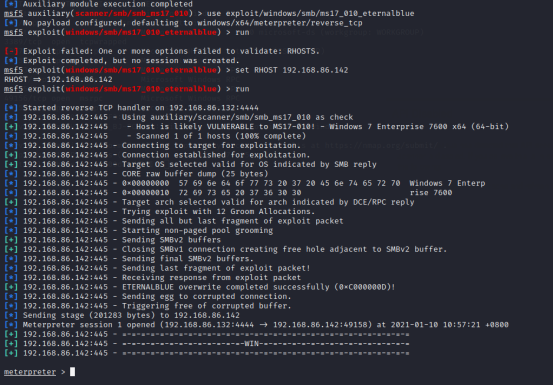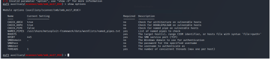 3.使用use auxiliary/scanner/smb/smb_ms17_010模块进行分析4.使用
